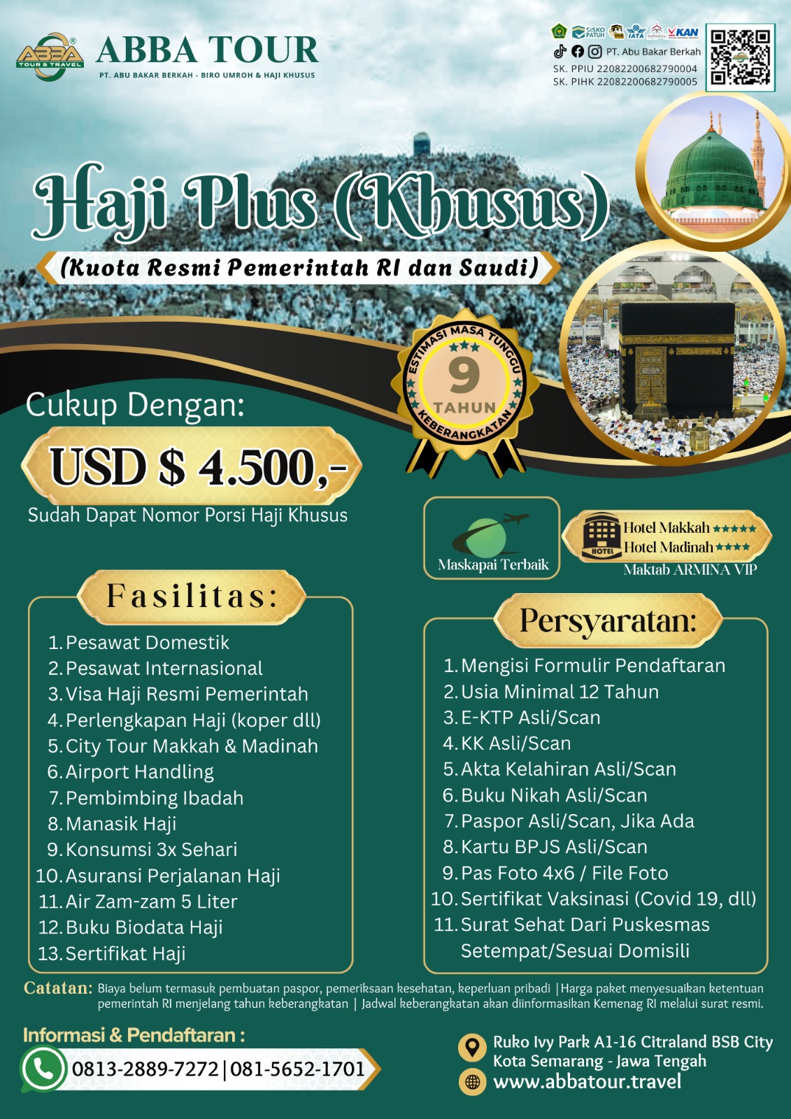 Read More"Selamat datang di ABBA TOUR, penyedia perjalanan Umrah dan Haji yang berkomitmen untuk memberikan pengalaman ibadah yang tak terlupakan bagi jamaahnya. Kami menyediakan paket perjalanan Umrah dan Haji yang lengkap dan terpercaya, disesuaikan dengan kebutuhan dan anggaran Anda. Dengan tim yang berpengalaman dan berdedikasi, kami menyediakan layanan yang komprehensif mulai dari proses pendaftaran hingga kembali ke tanah air setelah menunaikan ibadah. Kami menawarkan fasilitas akomodasi yang nyaman, transportasi yang aman dan nyaman, serta panduan yang berpengetahuan luas tentang tempat-tempat suci dan ibadah-ibadah yang harus dilakukan. Kami berkomitmen untuk memberikan layanan terbaik kepada jamaah kami, dengan menjaga kualitas, keamanan, dan kenyamanan sebagai prioritas utama. Sebagai agen perjalanan yang berlisensi dan terpercaya, kami siap membantu Anda menjalani ibadah Umrah dan Haji dengan penuh ketenangan dan kekhidmatan.
